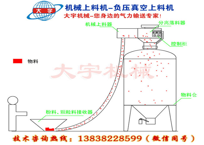 機械上料機的驅動電動機螺旋軸上聯有空心螺旋,空心螺旋在電動機的驅動下,在高壓耐磨塑膠管內高速旋轉。當料鬥需要上料時,啟動電動機帶動空心螺旋旋轉,原料被螺旋帶動形成位移,物料隨著位移進行老司机深夜福利视频,通過旋轉產生的離心力把物料拋出排料口,進入收料倉。